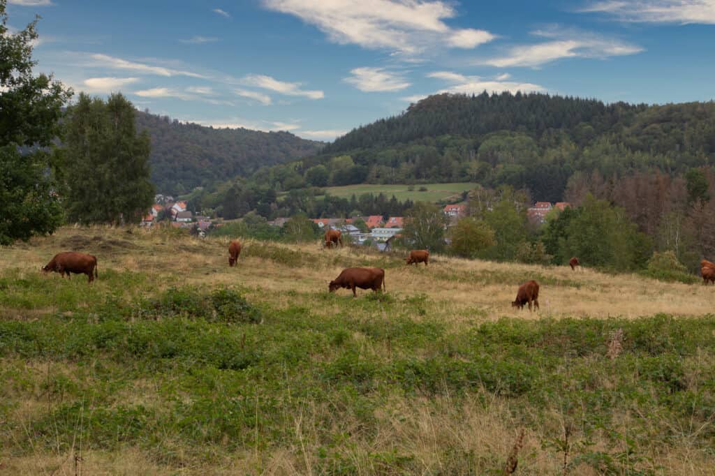Rotes Harzer Höhenvieh auf der Weide bei Wolfshagen im Harz